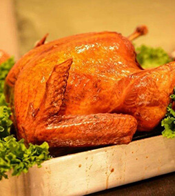 火鸡在烤制前会用各种香料进行腌制,整只烤制,鸡皮呈深棕色,肚子里还要塞上许多拌好的食物,如碎面包等。烤出的火鸡色泽金黄,鸡皮油润不开裂,鸡肉嫩滑。用刀切成薄片,浇卤汁、洒盐食用,味道鲜美。